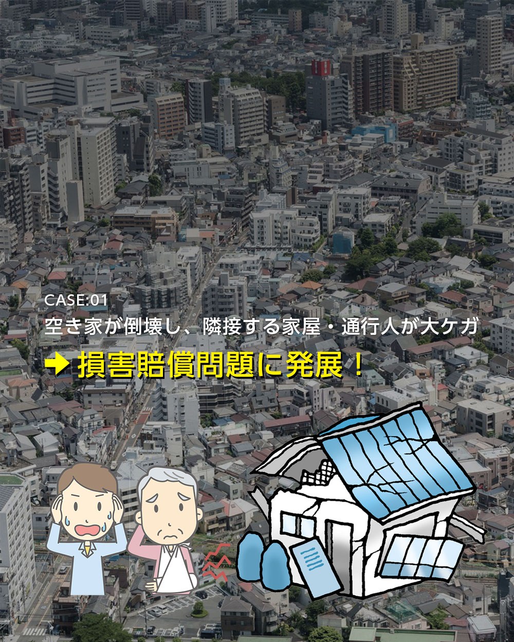 空き家や空き地を放置していると、自然災害や風雨で倒壊したり、不審者・犯罪者に放火されたり、不法侵入されたりするリスクが高まります。また、町並みや景観の悪化にもつながるため、早めに対策を打つことが大切です。